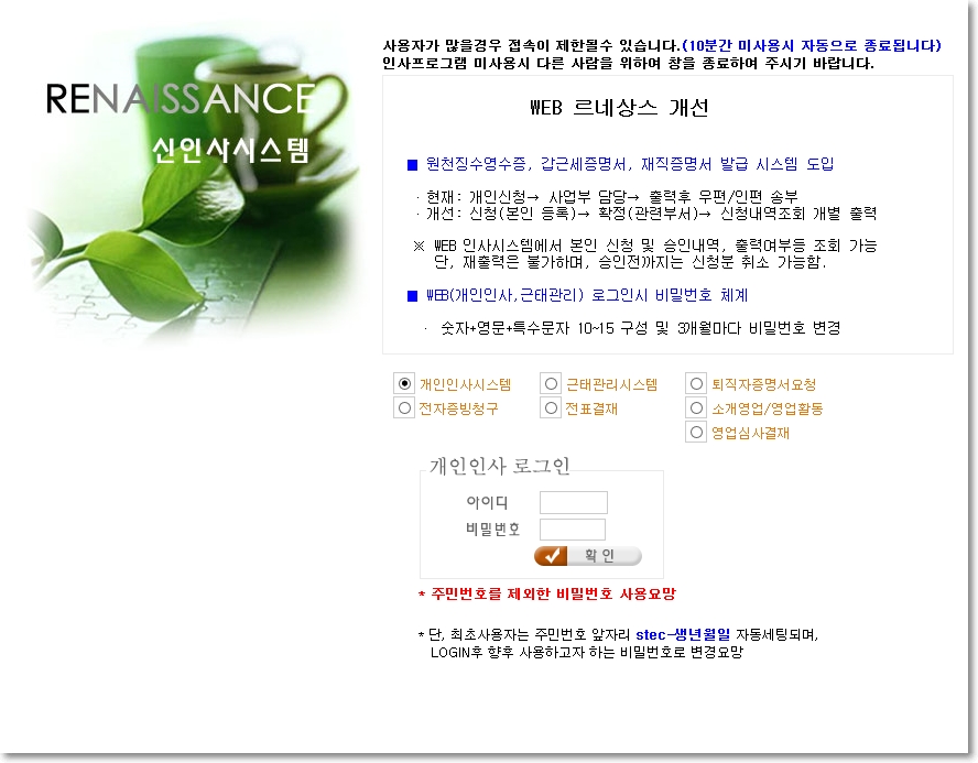 웹 기반 르네상스입니다. 직원이면 확인 가능한 복합적으로 기능이 적용되어 많은 정보를 얻어 갈 수 있는 사이트입니다. 또한 원천징수 영수증, 재직증명서 발급 신청하면 익일 승인되어 본인 출력이 가능합니다.